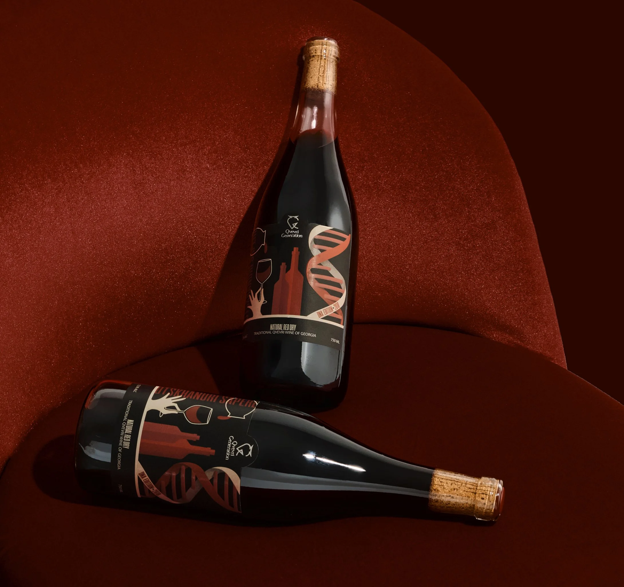 Two bottles of red wine with black and red label design, one standing upright and the other lying on a red textured surface.