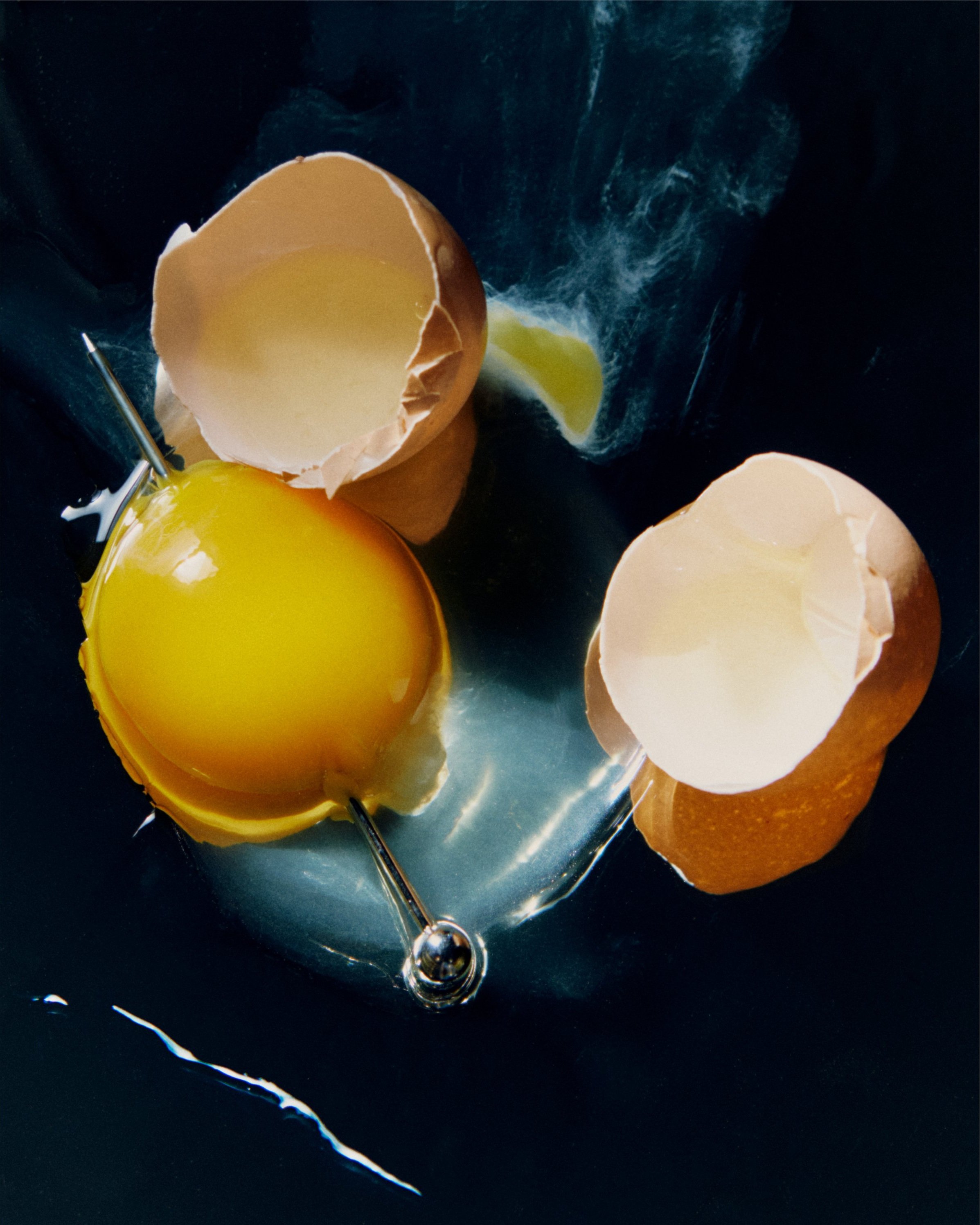 Eggshells and yellow yolks in a dark bowl with sewing pins.